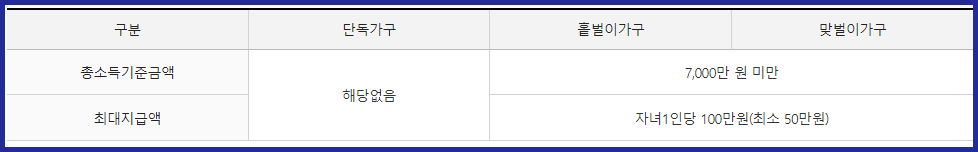 - 지급 금액: 자녀의 수와 가구의 소득에 따라 다르며, 최소 50만 원부터 시작하여 자녀 수에 따라 증가합니다.