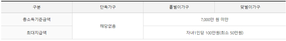 총소득이 일정 기준 이하이며 만 18세 이하의 자녀를 둔 가정이 주요 대상입니다.
