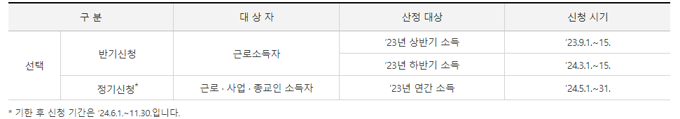 근로 소득만있는 자는 반기신청과 정기신청을 선택하여 신청할 수 있고, 사업 또는 종교인 소득이 있는 자는 정기신청을 하셔야합니다.