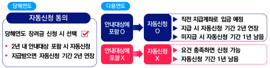 - 자동신청 제도: 60세이상 고령자 및 중증장애인이 장려금 신청기간에 동의하면, 향후 2년 내 신청안내 대상포함 시 자동으로 신청합니다.