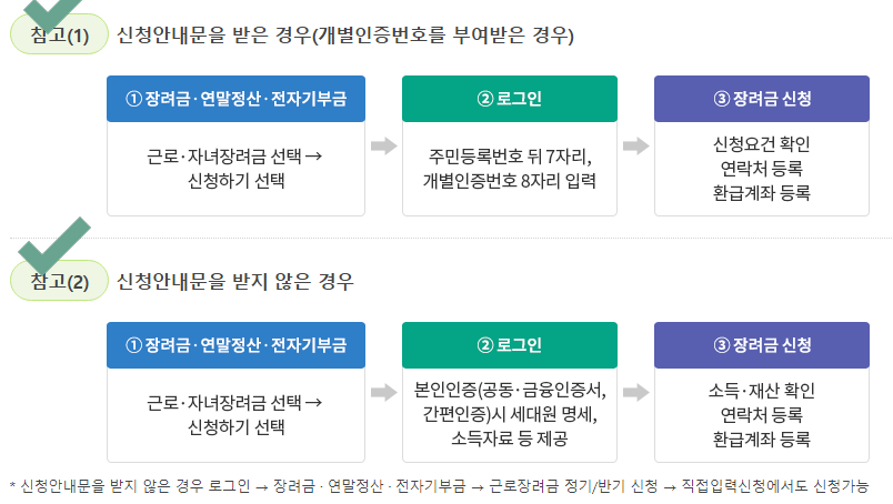 - 신청대리: 평일 9시~18시 (토,일,공휴일 제외)에 안내대상자가 동의하면 신청기간 운영되는 장려금 상담센터(1566-3636) 상담사나 세무서 직원이 신청대리 가능합니다.