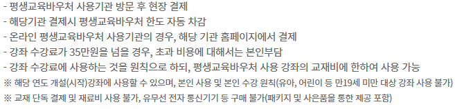 - 평생교육희망카드 발급 이후 국가평생교육진흥원에서 공지하는 날까지 결제 가능합니다.