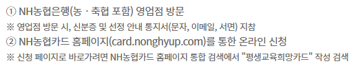 NH농협 BC체크카드(평생교육희망카드)를 이용하여 신청을 통해 발급받을 수 있습니다.