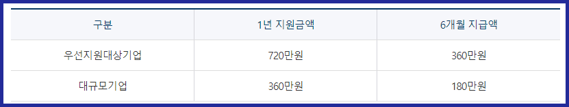 지원 금액: 지원 대상 근로자를 고용하여 6개월 이상 고용을 유지한 경우, 1년간 매 6개월마다 지급됩니다. 우선지원대상기업은 1년에 720만 원, 대규모기업은 360만 원을 지원받을 수 있습니다.