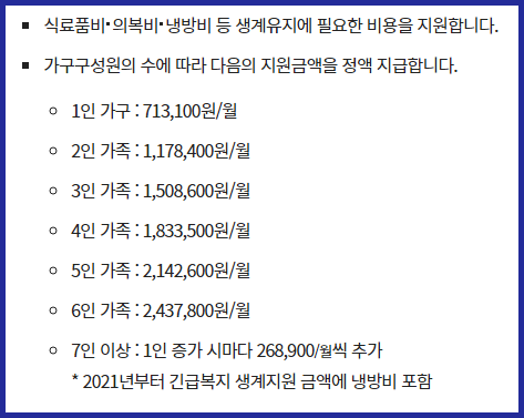- 가구 규모에 따라 지원 금액이 달라지며, 1인 가구는 월 713,100원이 지원됨.